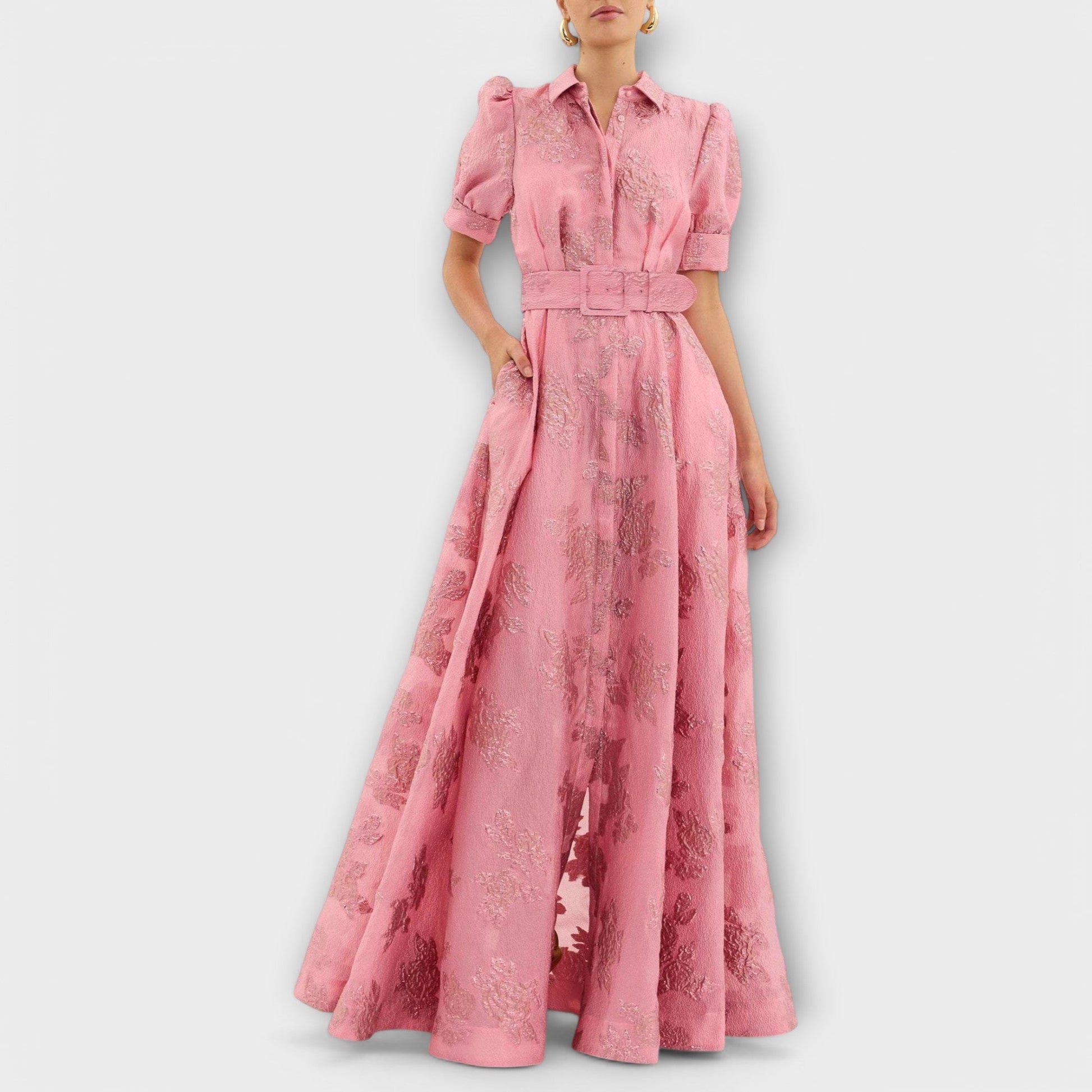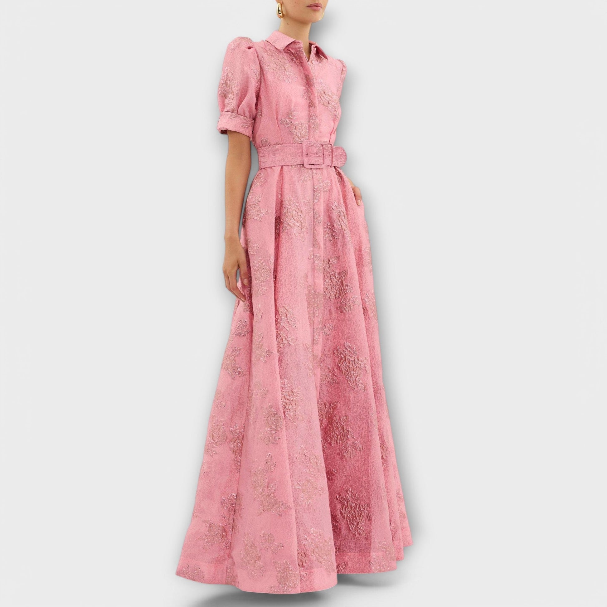 Design: Sukienka charakteryzuje się misternym kwiatowym wzorem w eleganckim różowym odcieniu, dopełnionym paskiem w talii oraz krótkimi rękawami.