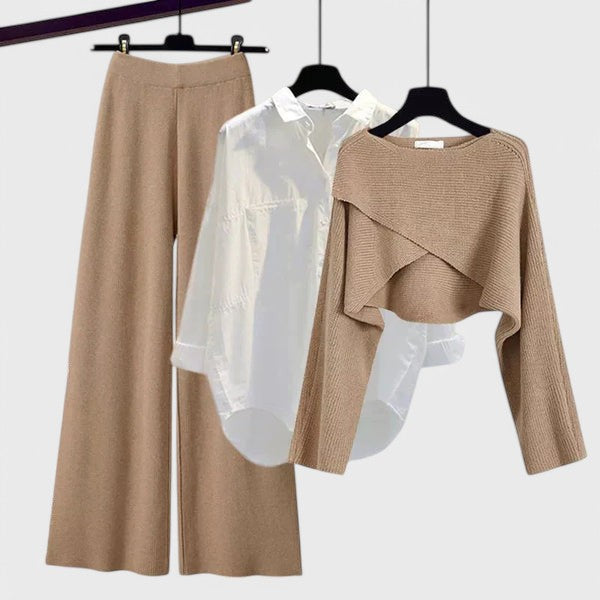 Ten trzyczęściowy zestaw dla kobiet jest idealny dla tych, którzy szukają stylu, komfortu i elastyczności. Zestaw składa się z modnego swetra, klasycznej białej bluzki i spodni o szerokich nogawkach, idealnych zarówno do biura, jak i na casualowe wyjścia. Połączenie organicznej bawełny i oddychającego poliestru zapewnia maksymalny komfort, a elastyczny materiał umożliwia swobodę ruchów.