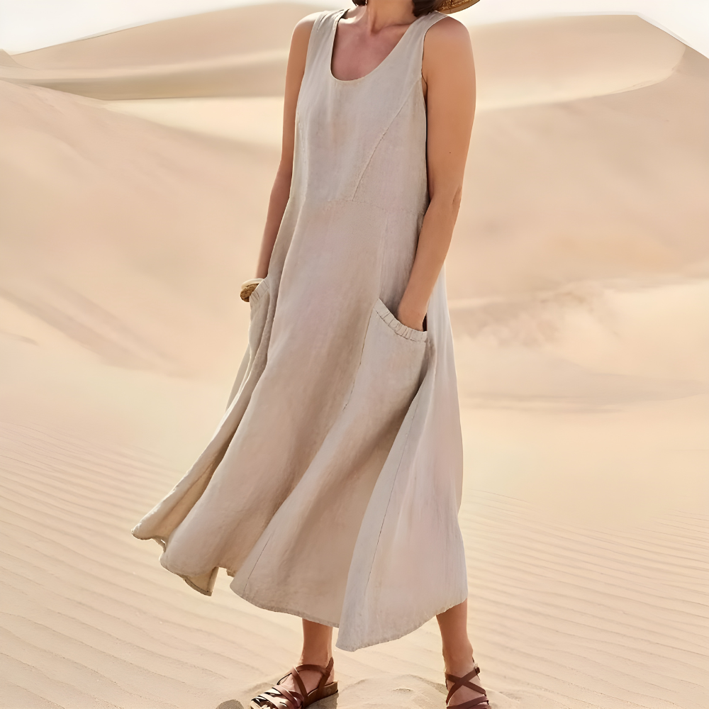 Ta sukienka łączy w sobie komfort i subtelną elegancję – z luźnym krojem, swobodnym ruchem i głębokimi kieszeniami, które zapewniają wygodę i styl każdego dnia.