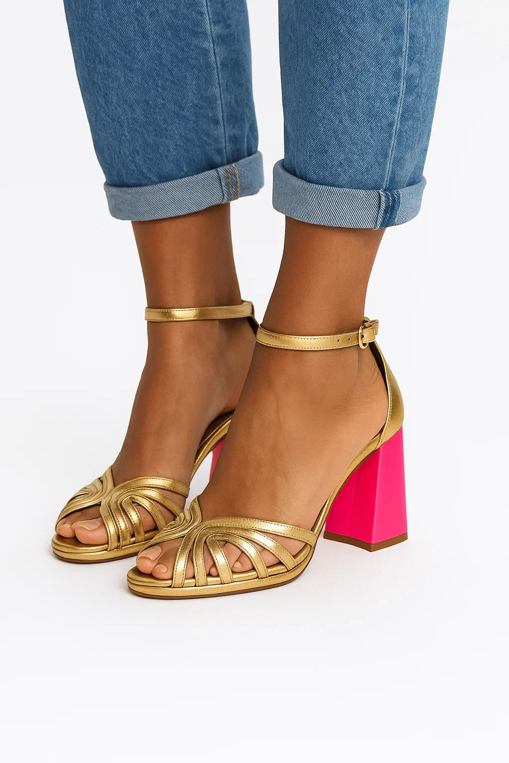 Sandały Livia™ to ucieleśnienie letniego luzu z odrobiną ekstrawagancji. Złoty połysk skóry pięknie odbija światło, a geometryczne wycięcia dodają lekkości i retro uroku. Całość dopełnia kontrastowy, neonowy obcas – nie do przeoczenia, ale wciąż szykowny.