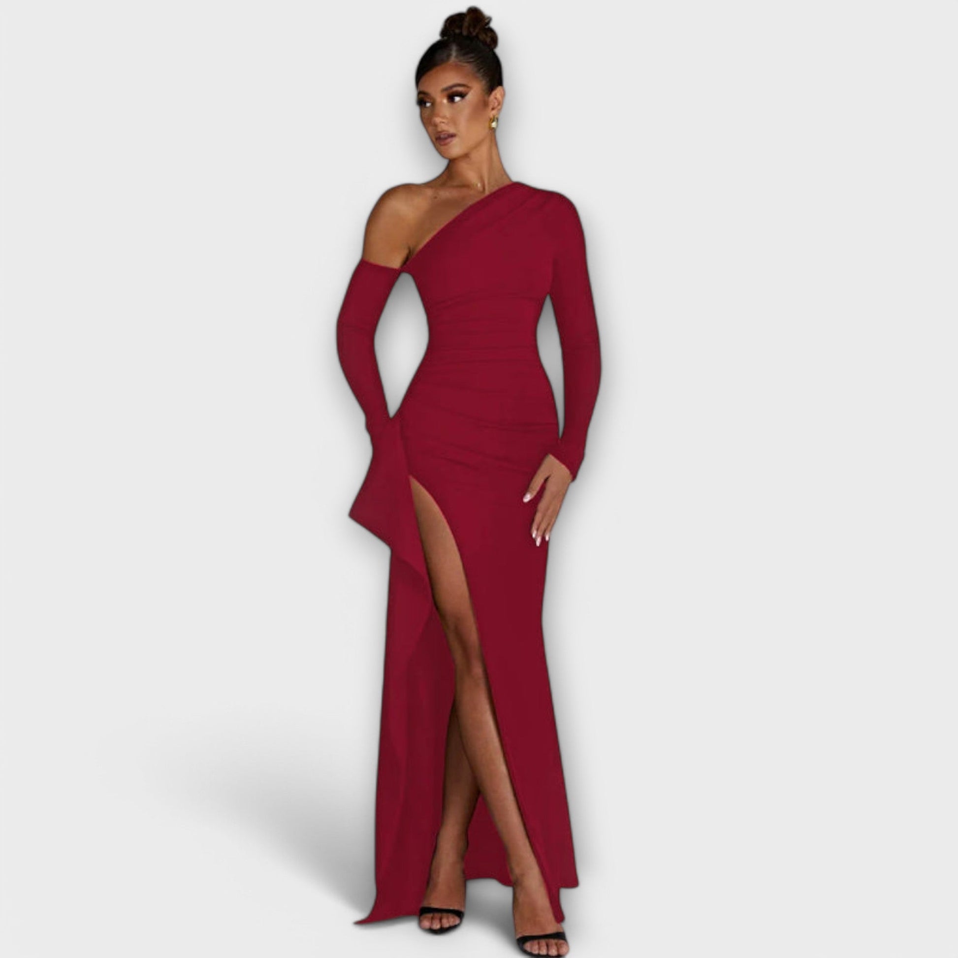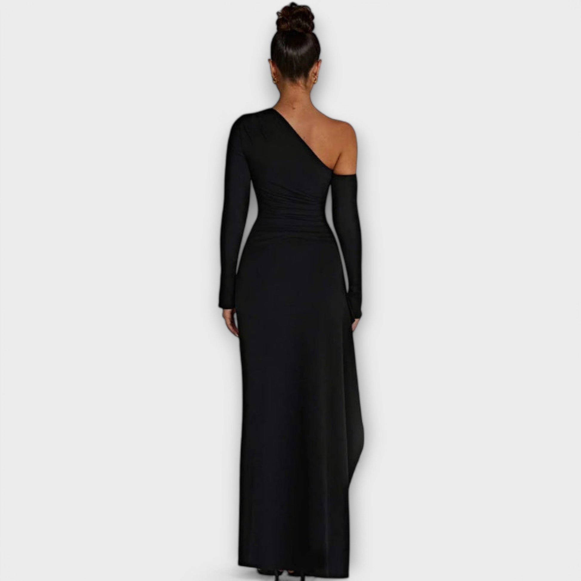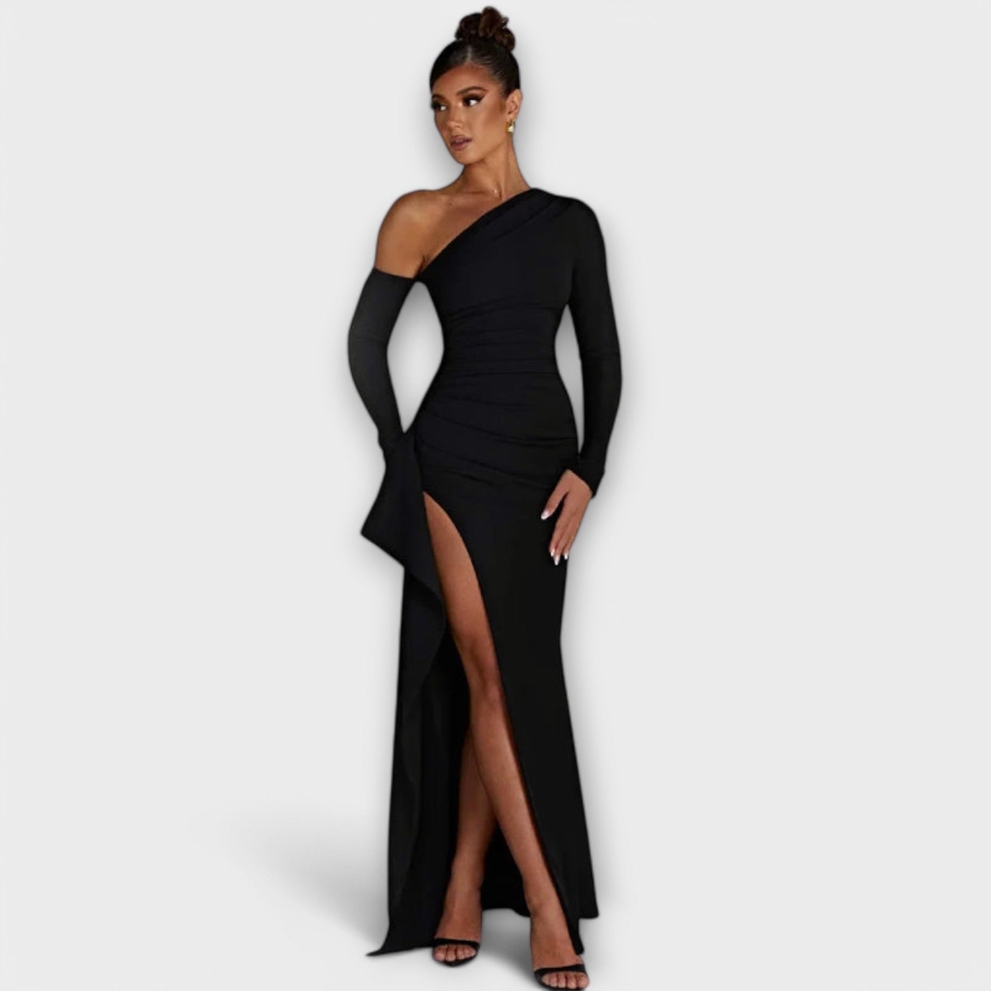 Nasza asymetryczna sukienka maxi to połączenie nowoczesnej elegancji z wyrafinowanym stylem. Z jednym gołym ramieniem i długim rękawem tworzy unikalny, asymetryczny wygląd, który jednocześnie prezentuje zmysłowość i wyrafinowanie. Duże rozcięcie na nodze dodaje sukience dynamiki i subtelnie eksponuje nogę, nadając całej stylizacji delikatnego, ale efektownego charakteru.